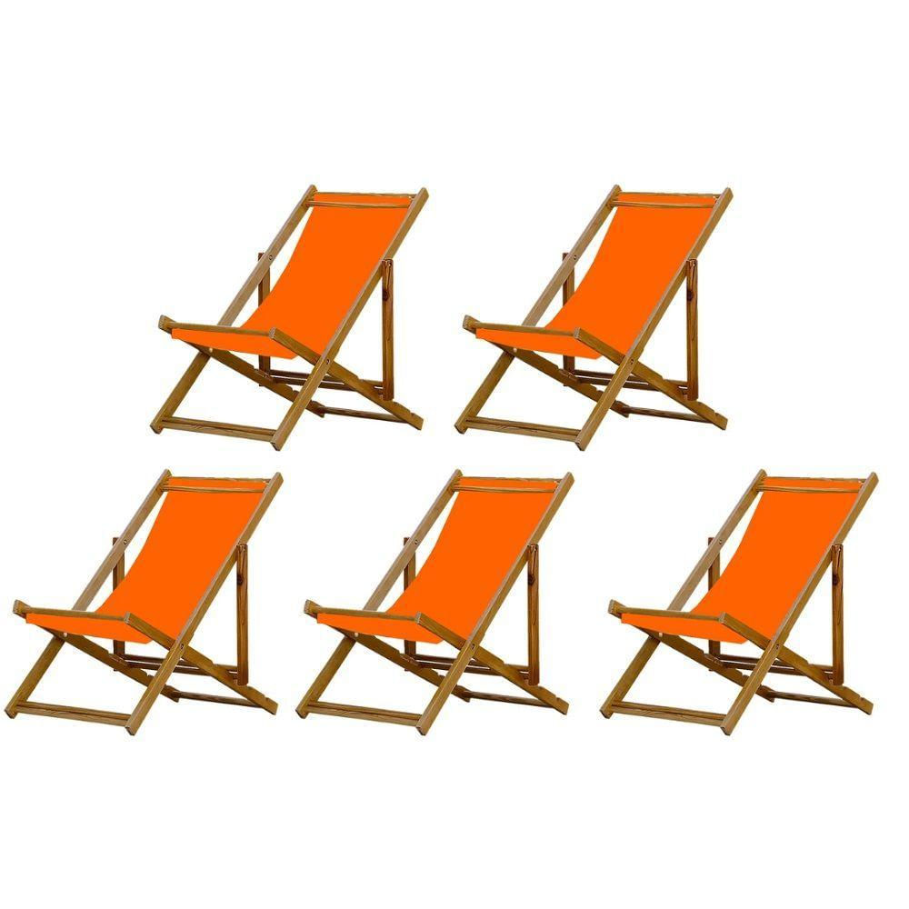 5 ESPREGUIÇADEIRAS EM MADEIRA ENVERNIZADA MEL S/B Sabe aquele final de tarde que você tanto espera para tirar um descanso merecido? Ou aquela viagem para a praia programada a meses com a família? Pois é, nossas cadeiras espreguiçadeira serve exatamente para esses momentos, com várias opções de cores, os tecidos além de charmosos são hidro-repelentes e se adequam a qualquer ambiente, facilmente removíveis para higienização.Estrutura 100% de madeira maciça e verniz especial, que garante sua qualidade e durabilidade, a espreguiçadeira é totalmente dobrável e reclinável (4 posições de ângulo), perfeita para seu lazer em todos os ambientes, seja ele externo ou interno, esse é o item que definitivamente não pode faltar na vida de quem de fato, quer aproveitar bons momentos! FICHA TÉCNICA DO PRODUTO: 04 Níveis de Regulagem de Altura; Tecido Reforçado; Fabricada em Madeira Maciça Pinus;Peso aproximado: 7,5 Kg; Suporta aproximadamente 120 kg; Cor da Madeira: Mel; Acabamento: Envernizada Dimensões aproximadas do Produto:Altura 1: 69 cm; Altura 2: 82 cm;Altura 3: 91 cm;Altura 4: 100 cm; Profundidade: 105 cm. Dimensão aproximada total: Comprimento: 135 cm; Largura: 60 cm; Informações Adicionais: Garantia: 90 dias contra defeitos de fabricação. Obs. A cor pode variar da foto conforme a tonalidade da madeira e iluminação..