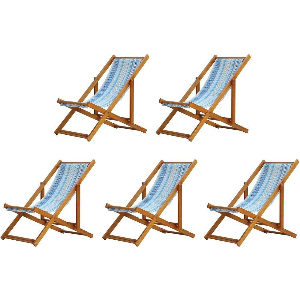 5 ESPREGUIÇADEIRAS EM MADEIRA ENVERNIZADA MEL S/B Sabe aquele final de tarde que você tanto espera para tirar um descanso merecido? Ou aquela viagem para a praia programada a meses com a família? Pois é, nossas cadeiras espreguiçadeira serve exatamente para esses momentos, com várias opções de cores, os tecidos além de charmosos são hidro-repelentes e se adequam a qualquer ambiente, facilmente removíveis para higienização.Estrutura 100% de madeira maciça e verniz especial, que garante sua qualidade e durabilidade, a espreguiçadeira é totalmente dobrável e reclinável (4 posições de ângulo), perfeita para seu lazer em todos os ambientes, seja ele externo ou interno, esse é o item que definitivamente não pode faltar na vida de quem de fato, quer aproveitar bons momentos! FICHA TÉCNICA DO PRODUTO: 04 Níveis de Regulagem de Altura; Tecido Reforçado; Fabricada em Madeira Maciça Pinus;Peso aproximado: 7,5 Kg; Suporta aproximadamente 120 kg; Cor da Madeira: Mel; Acabamento: Envernizada Dimensões aproximadas do Produto:Altura 1: 69 cm; Altura 2: 82 cm;Altura 3: 91 cm;Altura 4: 100 cm; Profundidade: 105 cm. Dimensão aproximada total: Comprimento: 135 cm; Largura: 60 cm; Informações Adicionais: Garantia: 90 dias contra defeitos de fabricação. Obs. A cor pode variar da foto conforme a tonalidade da madeira e iluminação..