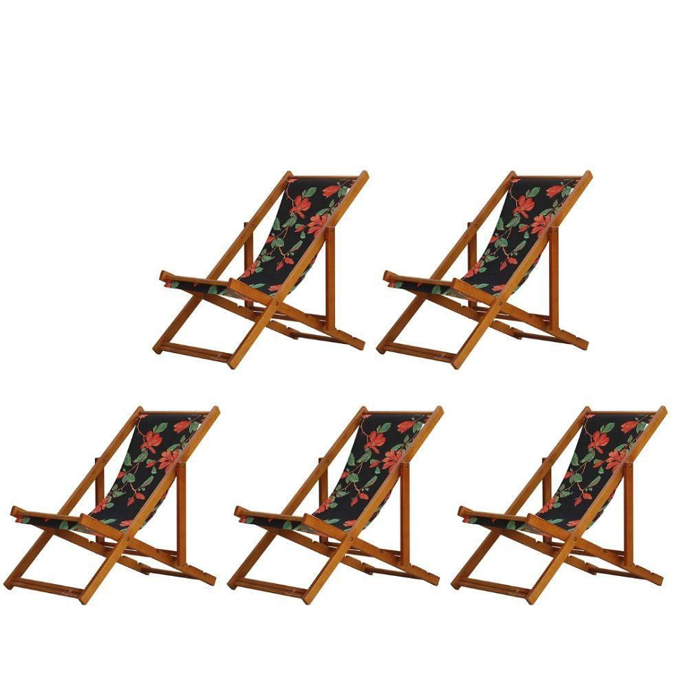 5 ESPREGUIÇADEIRAS EM MADEIRA ENVERNIZADA MEL S/B Sabe aquele final de tarde que você tanto espera para tirar um descanso merecido? Ou aquela viagem para a praia programada a meses com a família? Pois é, nossas cadeiras espreguiçadeira serve exatamente para esses momentos, com várias opções de cores, os tecidos além de charmosos são hidro-repelentes e se adequam a qualquer ambiente, facilmente removíveis para higienização.Estrutura 100% de madeira maciça e verniz especial, que garante sua qualidade e durabilidade, a espreguiçadeira é totalmente dobrável e reclinável (4 posições de ângulo), perfeita para seu lazer em todos os ambientes, seja ele externo ou interno, esse é o item que definitivamente não pode faltar na vida de quem de fato, quer aproveitar bons momentos! FICHA TÉCNICA DO PRODUTO: 04 Níveis de Regulagem de Altura; Tecido Reforçado; Fabricada em Madeira Maciça Pinus;Peso aproximado: 7,5 Kg; Suporta aproximadamente 120 kg; Cor da Madeira: Mel; Acabamento: Envernizada Dimensões aproximadas do Produto:Altura 1: 69 cm; Altura 2: 82 cm;Altura 3: 91 cm;Altura 4: 100 cm; Profundidade: 105 cm. Dimensão aproximada total: Comprimento: 135 cm; Largura: 60 cm; Informações Adicionais: Garantia: 90 dias contra defeitos de fabricação. Obs. A cor pode variar da foto conforme a tonalidade da madeira e iluminação..