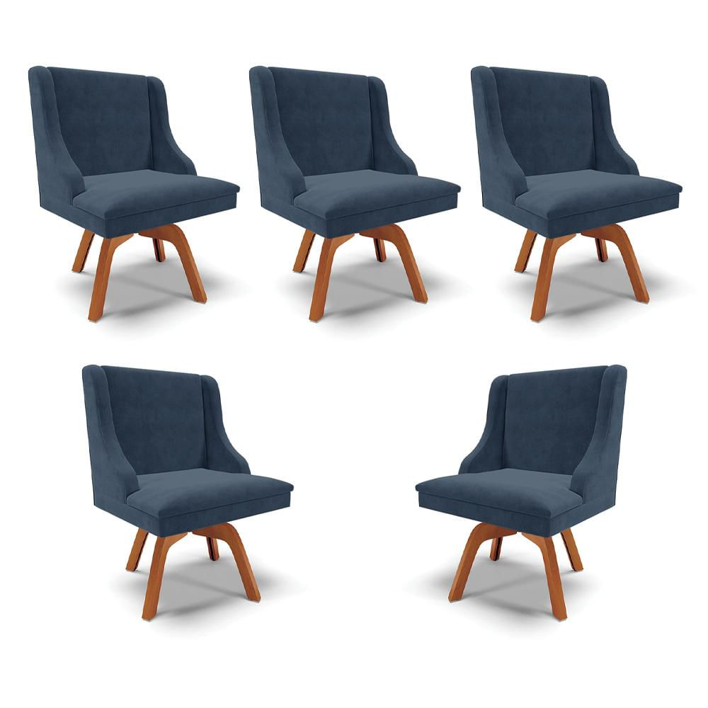 Kit 5 Cadeiras Decorativas Sala de Jantar Base Giratória de Madeira Firenze Suede Azul Marinho/Natural G19 - Gran Belo