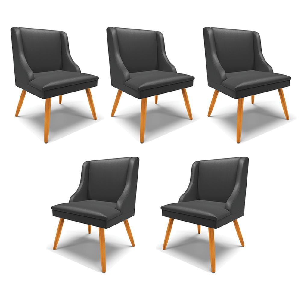 Kit 5 Cadeiras Decorativas Sala de Jantar Pés Palito de Madeira Firenze PU Preto Fosco/Natural G19 - Gran Belo
