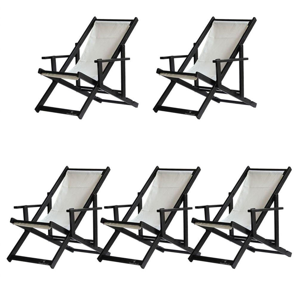 5 ESPREGUIÇADEIRAS ENVERNIZADAS BLACK C/B Sabe aquele final de tarde que você tanto espera para tirar um descanso merecido? Ou aquela viagem para a praia programada a meses com a família? Pois é, nossas cadeiras espreguiçadeira serve exatamente para esses momentos, com várias opções de cores, os tecidos além de charmosos são hidro-repelentes e se adequam a qualquer ambiente, facilmente removíveis para higienização.Estrutura 100% de madeira maciça e verniz especial, que garante sua qualidade e durabilidade, a espreguiçadeira é totalmente dobrável e reclinável (4 posições de ângulo), com descanso para braço, sendo possível montar invertida sem o encosto de braço, perfeita para seu lazer em todos os ambientes, seja ele externo ou interno, esse é o item que definitivamente não pode faltar na vida de quem de fato, quer aproveitar bons momentos! FICHA TÉCNICA DO PRODUTO:04 Níveis de Regulagem de Altura;Tecido Reforçado;Fabricada em Madeira Maciça Pinus;Peso aproximado: 7,5 Kg;Suporta aproximadamente 120 kg;Cor da Madeira: Preta Dimensões aproximadas do Produto:Altura 1: 69 cm;Altura 2: 82 cm;Altura 3: 91 cm;Altura 4: 100 cm;Profundidade: 105 cm. Dimensão aproximada total:Comprimento: 135 cm;Largura: 66 cm; Informações Adicionais:Garantia: 90 dias contra defeitos de fabricação.Acompanha 5 cadeiras Obs. A cor pode variar da foto conforme a tonalidade da madeira e iluminação.. !!