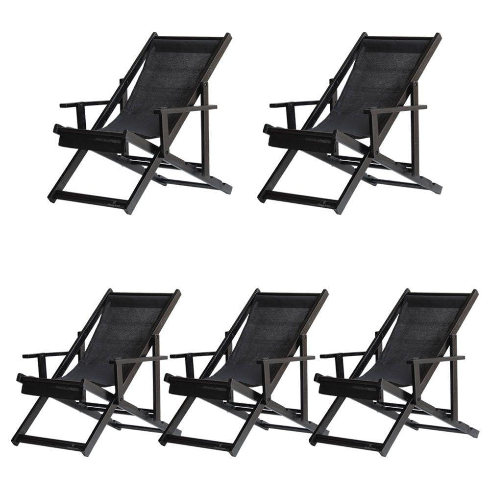 5 ESPREGUIÇADEIRAS ENVERNIZADAS BLACK C/B Sabe aquele final de tarde que você tanto espera para tirar um descanso merecido? Ou aquela viagem para a praia programada a meses com a família? Pois é, nossas cadeiras espreguiçadeira serve exatamente para esses momentos, com várias opções de cores, os tecidos além de charmosos são hidro-repelentes e se adequam a qualquer ambiente, facilmente removíveis para higienização.Estrutura 100% de madeira maciça e verniz especial, que garante sua qualidade e durabilidade, a espreguiçadeira é totalmente dobrável e reclinável (4 posições de ângulo), com descanso para braço, sendo possível montar invertida sem o encosto de braço, perfeita para seu lazer em todos os ambientes, seja ele externo ou interno, esse é o item que definitivamente não pode faltar na vida de quem de fato, quer aproveitar bons momentos! FICHA TÉCNICA DO PRODUTO:04 Níveis de Regulagem de Altura;Tecido Reforçado;Fabricada em Madeira Maciça Pinus;Peso aproximado: 7,5 Kg;Suporta aproximadamente 120 kg;Cor da Madeira: Preta Dimensões aproximadas do Produto:Altura 1: 69 cm;Altura 2: 82 cm;Altura 3: 91 cm;Altura 4: 100 cm;Profundidade: 105 cm. Dimensão aproximada total:Comprimento: 135 cm;Largura: 66 cm; Informações Adicionais:Garantia: 90 dias contra defeitos de fabricação.Acompanha 5 cadeiras Obs. A cor pode variar da foto conforme a tonalidade da madeira e iluminação.. !!