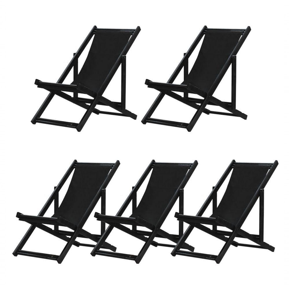 5 ESPREGUIÇADEIRAS ENVERNIZADAS BLACK S/B Sabe aquele final de tarde que você tanto espera para tirar um descanso merecido? Ou aquela viagem para a praia programada a meses com a família? Pois é, nossas cadeiras espreguiçadeira serve exatamente para esses momentos, com várias opções de cores, os tecidos além de charmosos são hidro-repelentes e se adequam a qualquer ambiente, facilmente removíveis para higienização.Estrutura 100% de madeira maciça e verniz especial, que garante sua qualidade e durabilidade, a espreguiçadeira é totalmente dobrável e reclinável (4 posições de ângulo), perfeita para seu lazer em todos os ambientes, seja ele externo ou interno, esse é o item que definitivamente não pode faltar na vida de quem de fato, quer aproveitar bons momentos! FICHA TÉCNICA DO PRODUTO:04 Níveis de Regulagem de Altura;Tecido Reforçado;Fabricada em Madeira Maciça Pinus;Peso aproximado: 7,5 Kg;Suporta aproximadamente 120 kg;Cor da Madeira: PretaAcabamento: Envernizada Dimensões aproximadas do Produto:Altura 1: 69 cm;Altura 2: 82 cm;Altura 3: 91 cm;Altura 4: 100 cm;Profundidade: 105 cm. Dimensão aproximada total:Comprimento: 135 cm;Largura: 60 cm; Informações Adicionais:Garantia: 90 dias contra defeitos de fabricação.Acompanha 5 cadeiras Obs. A cor pode variar da foto conforme a tonalidade da madeira e iluminação..