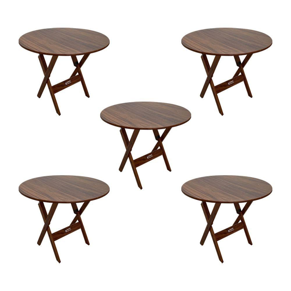 Kit 5 Mesas Dobráveis De Madeira Redonda 90cm Imbuia - TarimatãA Mesa redonda dobrável é ideal para bares, restaurantes, estabelecimentos, áreas de lazer e também para sua casa. Em madeira maciça tornando resistente e durável. Seu design permite ser encaixado em qualquer ambiente, trazendo um toque a mais para seu estabelecimento. Além de sua durabilidade, o que lhe trará conforto para servir seus clientes. Por ser dobrável torna-se mais fácil guardar, manusear e limpar o produto.CARACTERÍSTICASTipo: Mesa DobrávelModelo: RedondoCor: ImbuiaDIMENSÕES DA MESAAltura: 77cmAltura fechado: 98cmDiâmetro: 90cmAtenção: EVITE USAR PRODUTOS ABRASIVOS E QUÍMICOS PARA LIMPEZA DO PRODUTO, aconselha-se o uso de pano umedecido para melhor conservação; mantenha o produto fora de chuva e sol constantes.ATENÇÃOIMAGENS MERAMENTE ILUSTRATIVAS REALIZADO EDIÇÃO, PODENDO HAVER UMA PEQUENA VARIAÇÃO DE COR DEPENDENDO DE CADA TELA OU MONITOR.Kit 5 Mesas Dobráveis de Madeira Redonda 90cm Imbuia - Tarimatã