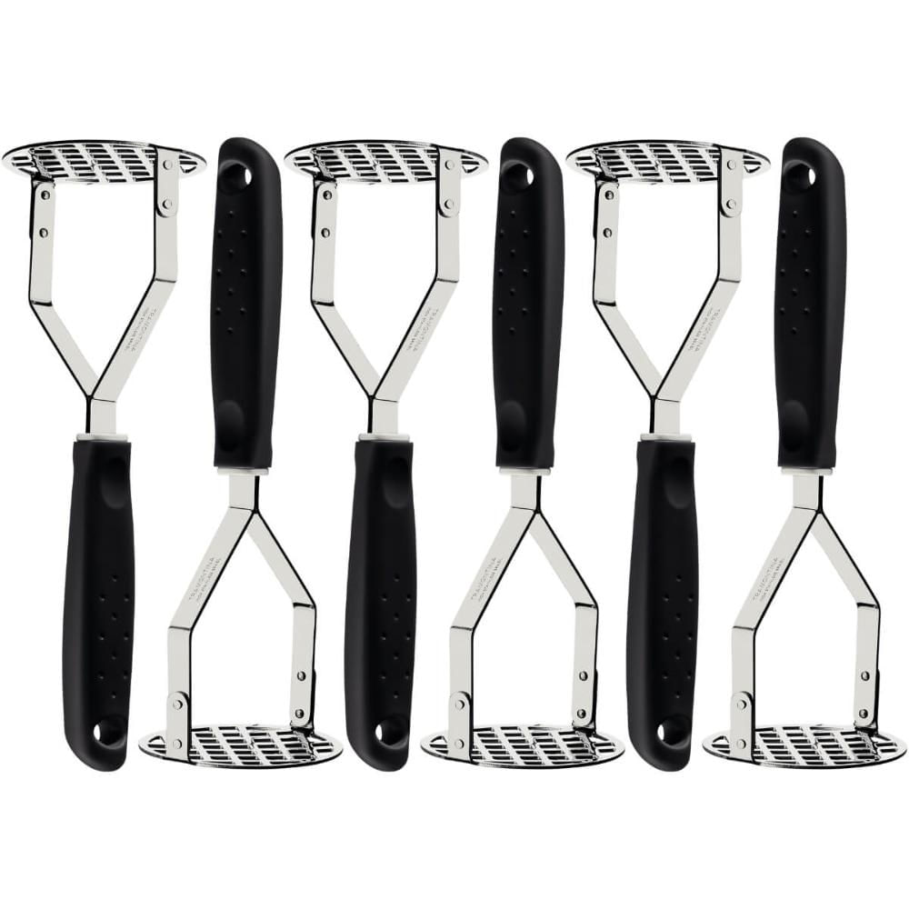 Garantia: 90 dias / Peso de cada: 110g / Cor: preto / Ref: 7794465436070; Dimensões de cada: 23,8cm (C) x 8,3cm (L) x 7,9cm (A); Materiais: aço inox e polipropileno (PP); Conteúdo: 6 amassadores de batatas.