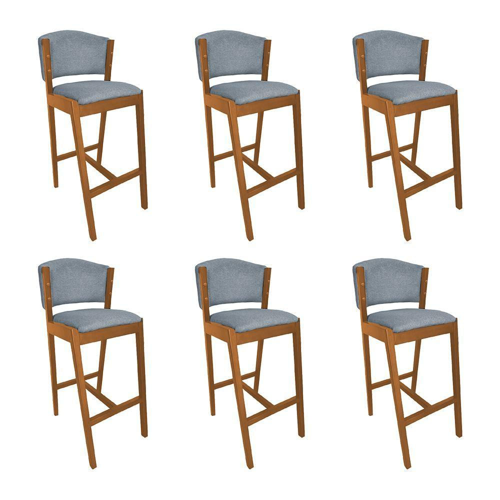 Kit 6 Banquetas Alta De Madeira Maciça Cerejeira Premium Ana Com Encosto Linho Cinza - Cor: Cinza