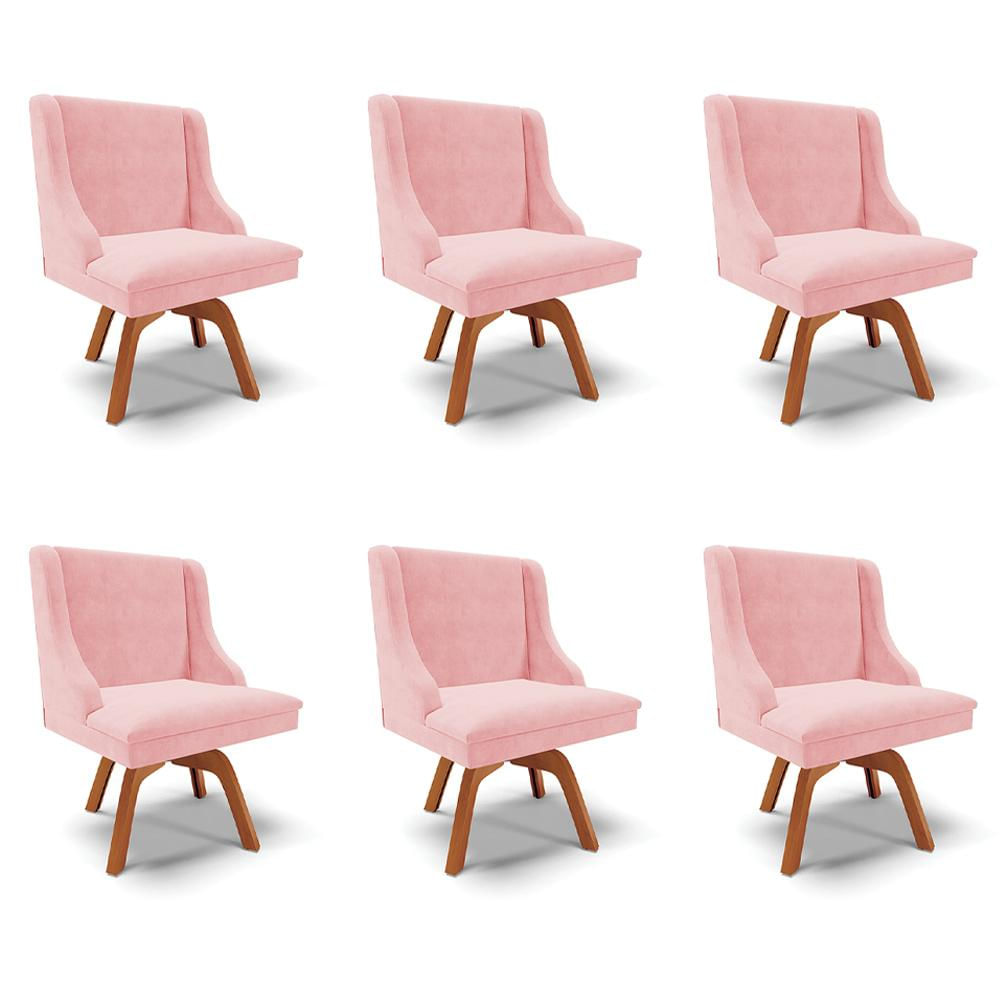Kit 6 Cadeiras Decorativas Sala de Jantar Base Giratória de Madeira Firenze Suede Rosa Bebê/Natural G19 - Gran Belo
