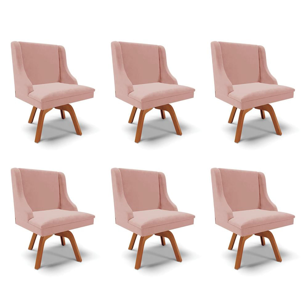 Kit 6 Cadeiras Decorativas Sala de Jantar Base Giratória de Madeira Firenze Veludo Rosê/Natural G19 - Gran Belo