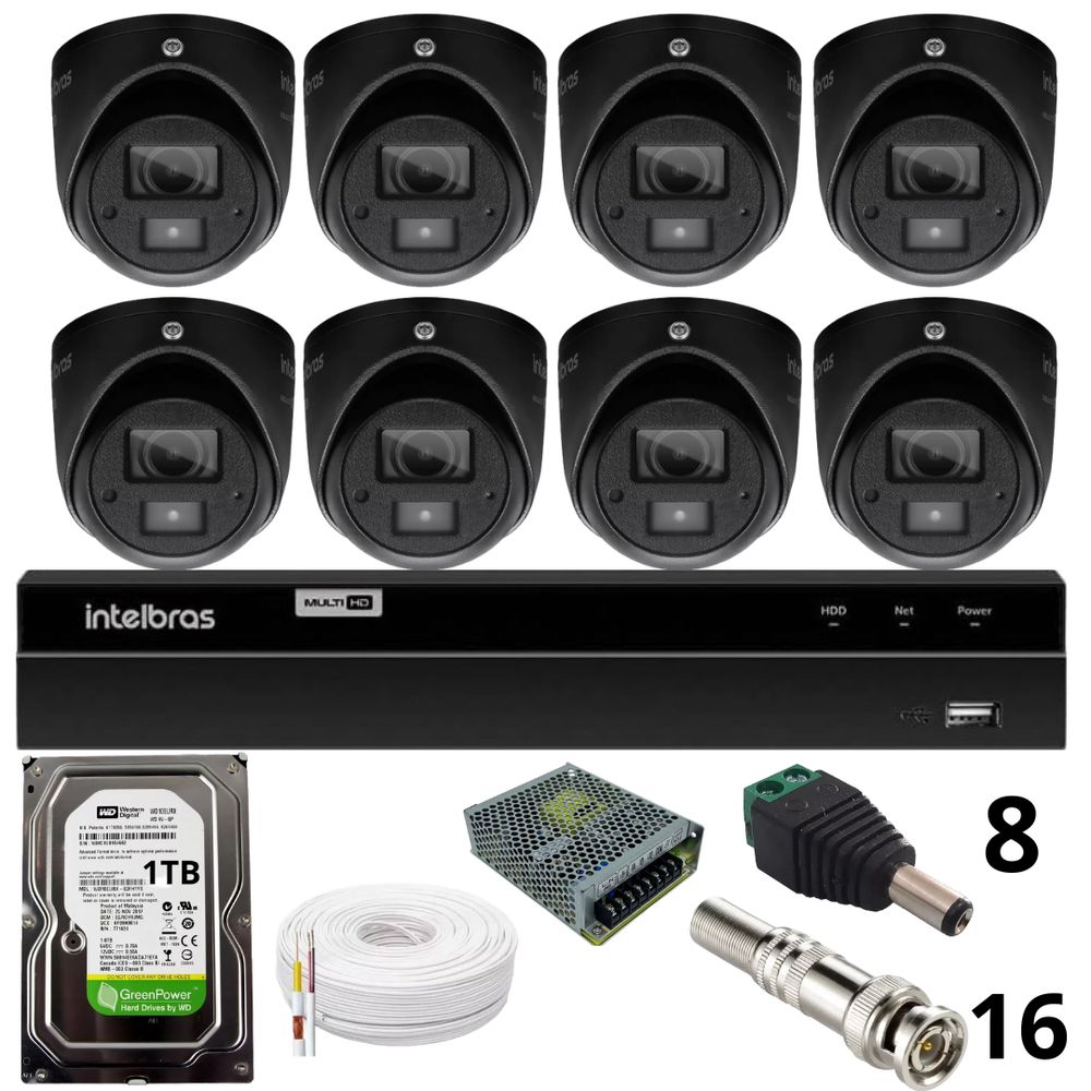 Kit 8 Câmeras Bullet 3220d Mini Black Com Áudio Dvr Intelbras 1216-c Mhdx Com Acesso Remoto Hd 1tb