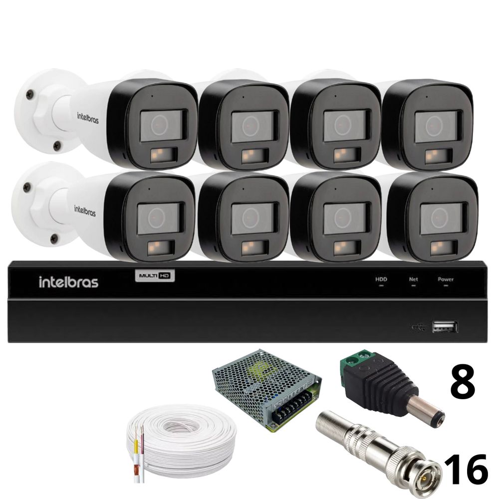Kit 8 Câmeras Intelbras Bullet 3220b Full Color Com Áudio Dvr Intelbras 1216-c Mhdx Com Acesso Remoto Sem Hd