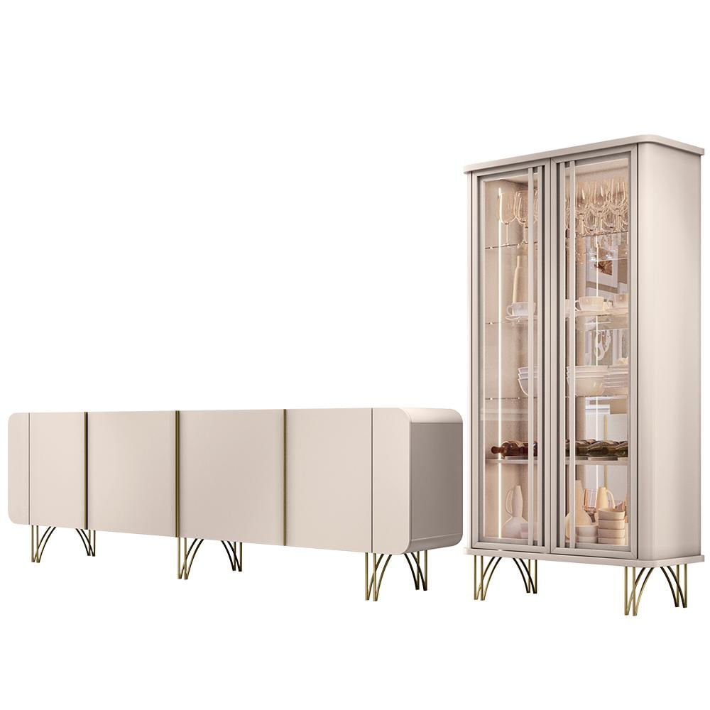 O Kit perfeito para sua sala de jantar acaba de chegar! Com acabamentos impecáveis, torna o espaço mais elegante e garante grande destaque para a composição dos móveis na ambientação. Na cristaleira, o espelho ao fundo e iluminação led, expressa sofisticação e modernidade, que expõe com ainda mais graciosidade as louças, cristais, taças e decorações em geral. O Buffet oferecendo amplo espaço para organização de louças, talheres e outros objetos, confere organização e praticidade! O design orgânico arredondado mesclado com o estilo industrial é uma opção moderna que traz leveza e harmonia ao ambiente. Os pés em aço com acabamento dourado conferem um toque de luxo e requinte, contrastando com a transparência das portas de vidro. Pode ser disposta na sala de jantar, de estar, cozinha, escritório ou até em corredores e espaços de circulação, aposta perfeita para quem deseja inovar sem erro! Dimensões do Buffet (L x A x P)