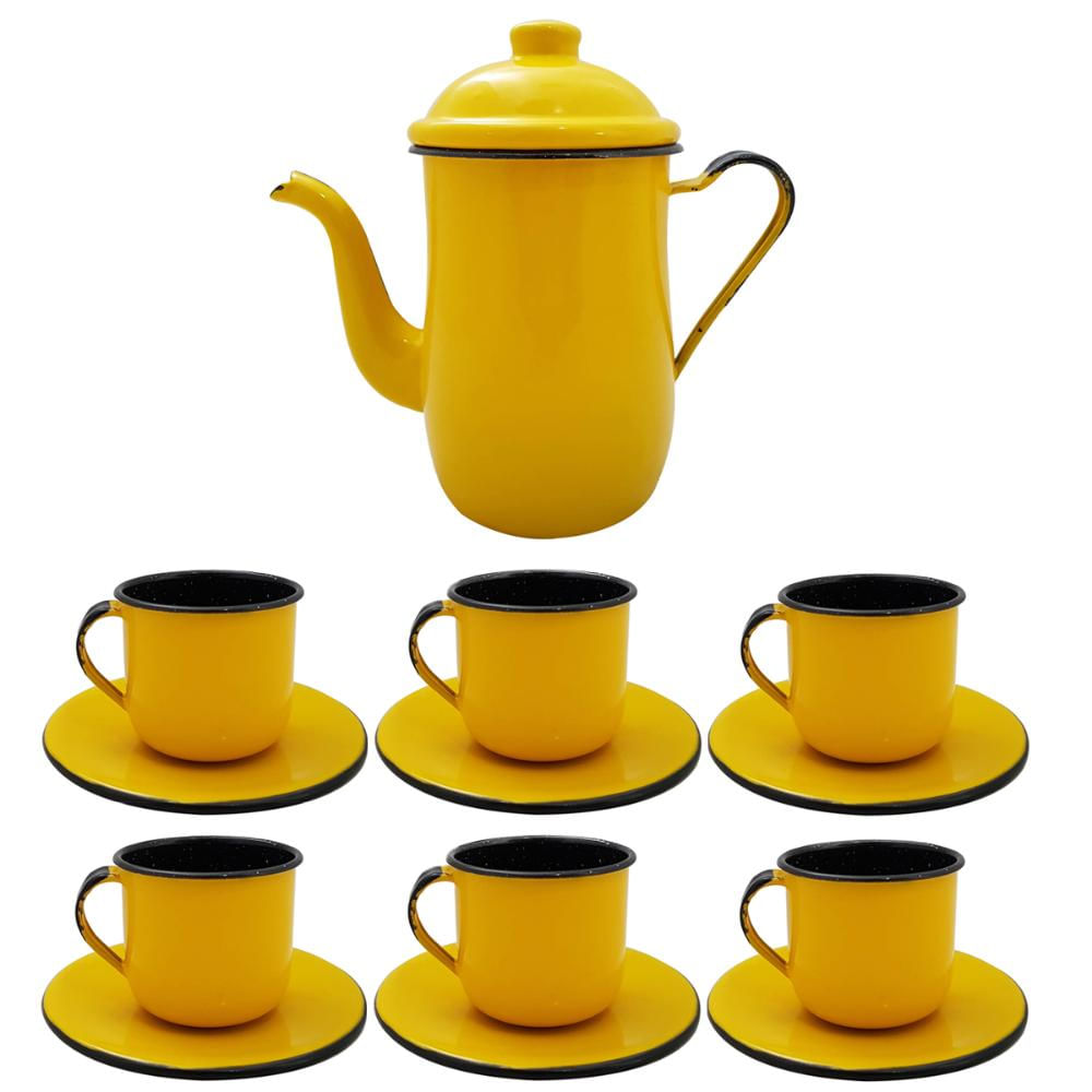 Kit Bule De Café E Chá Com 6 Xícaras e Pires Aço Esmaltado Amarelo