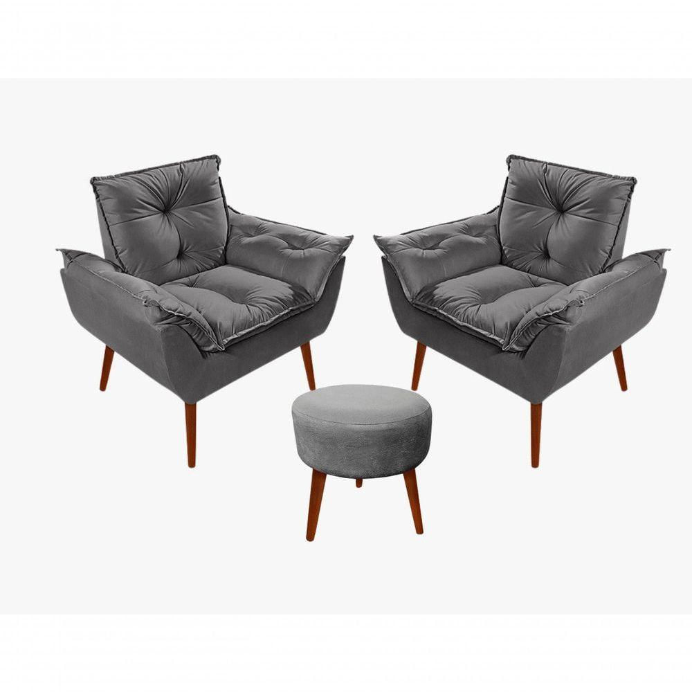 Kit C/02 Poltronas Opala + 01 Puff Redondo Danny Suede Cinza Escuro -