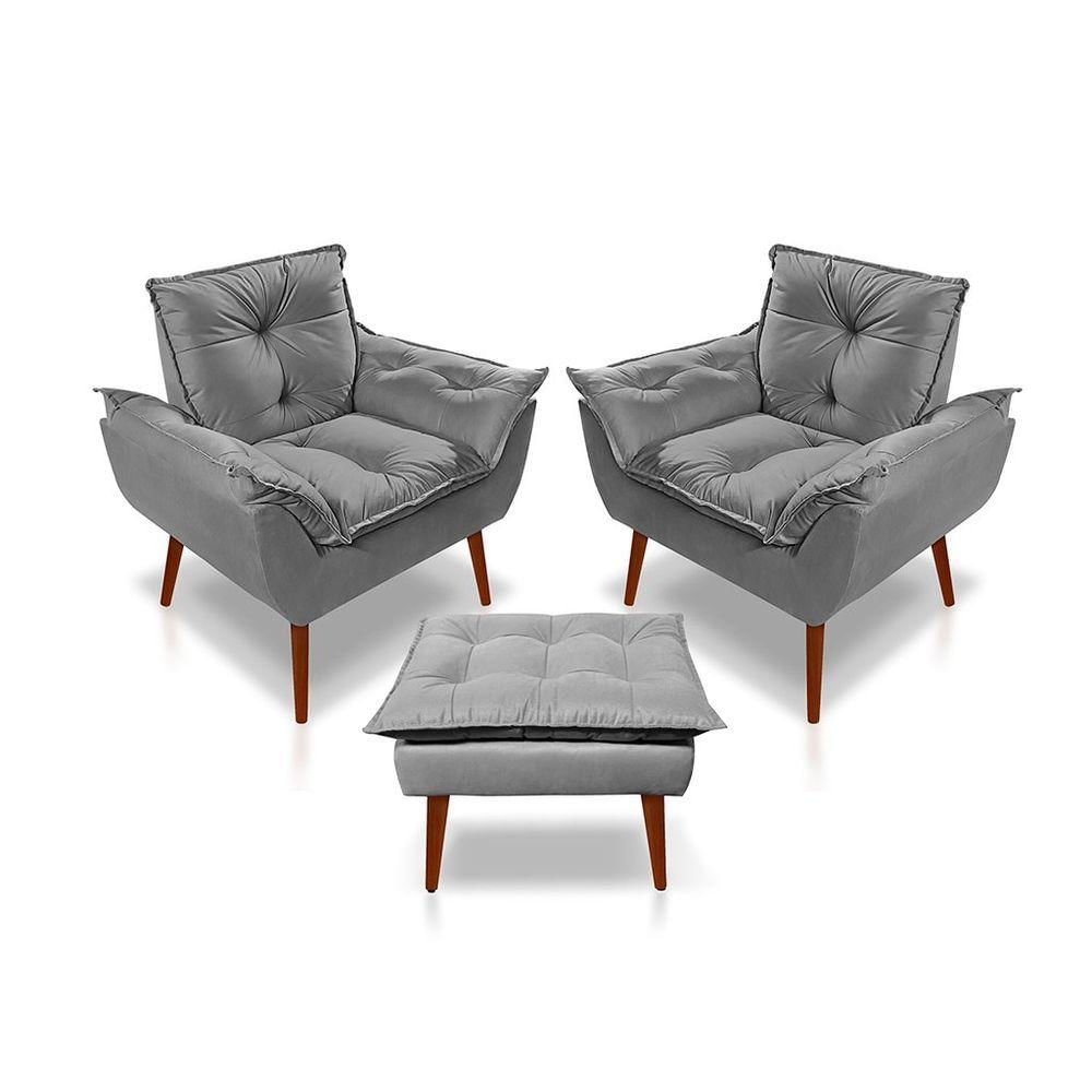 Kit C/2 Poltronas Opala + 01 Puff Opala Elegante Suede Cinza Claro