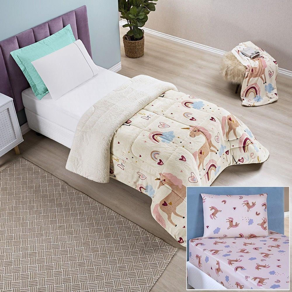 Kit Coberdrom + Jogo De Cama Bouti Kids Solteiro 03 Peças 100% Poliéster - Unicórnio