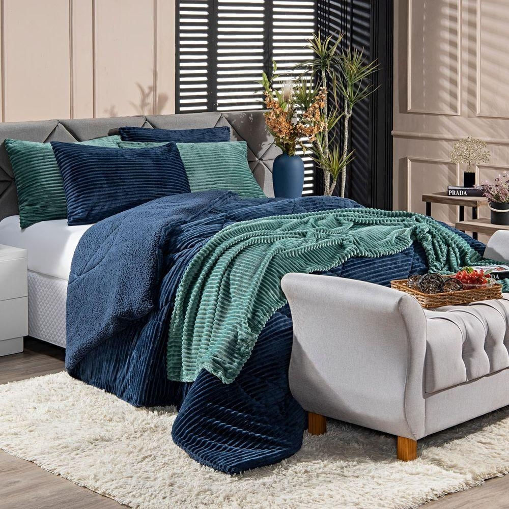 - Kit Coberdrom Canelado Boston King 03 Peças - Dupla Face Manta E Sherpa Colorida Cor Azul Marinho