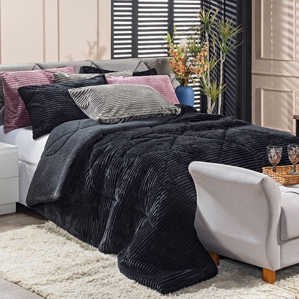 - Kit Coberdrom Canelado Boston Solteiro 02 Peças - Dupla Face Manta E Sherpa Colorida Cor Preto