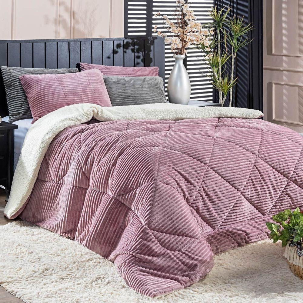 - Kit Coberdrom Canelado Boston Solteiro 02 Peças - Dupla Face Manta E Sherpa Colorida Cor Rosê