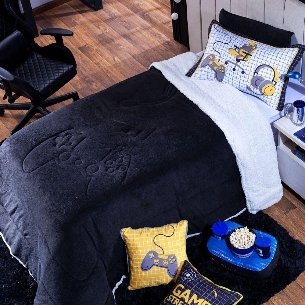 Kit Coberdrom Cobertor Solteiro Game Streamer Preto Dupla Face Com Fronha 02 Peças - Tecido Mantinha E Sherpa