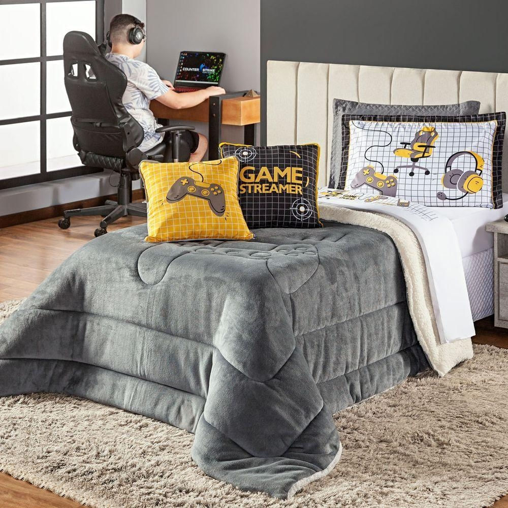 Kit Coberdrom Game Streamer Cinza C/ Almofadas Solteiro 04 Peças - Dupla Face Sherpa E Mantinha