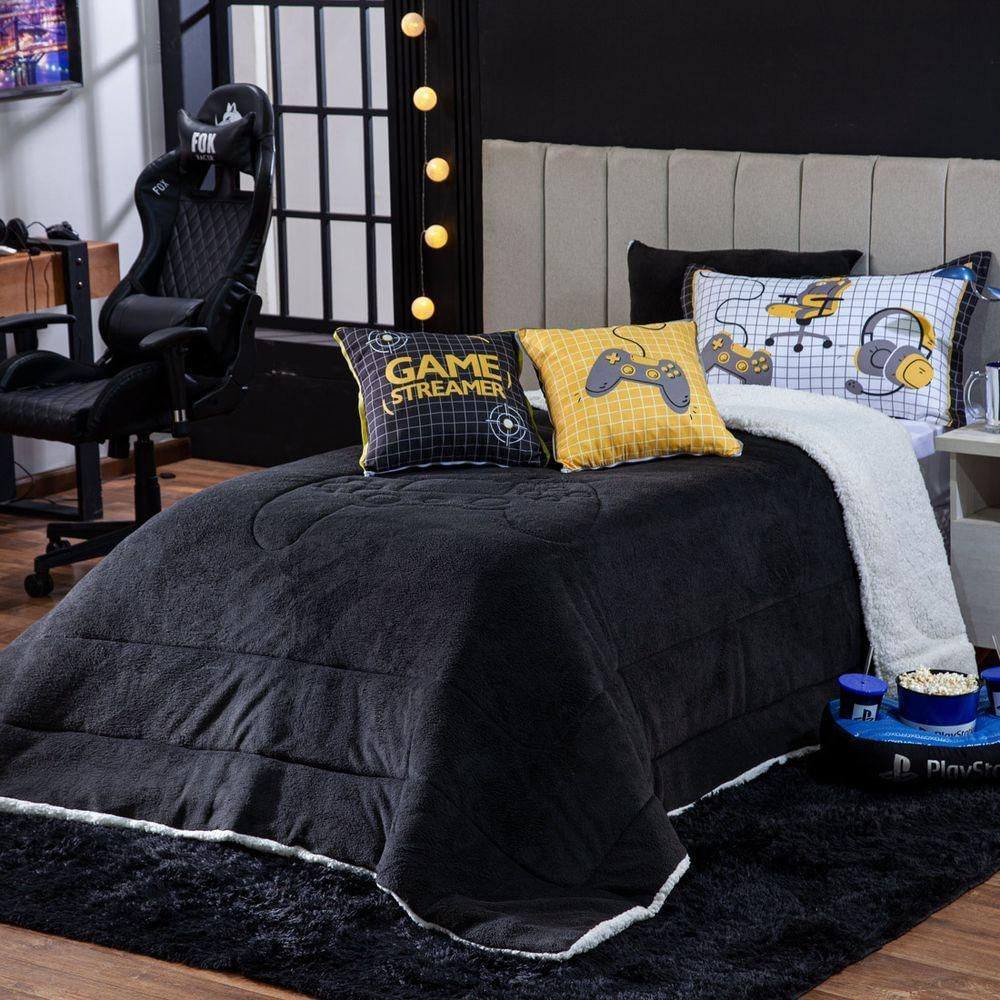 Kit Coberdrom Game Streamer Preto C/ Almofadas Solteiro 04 Peças - Dupla Face Sherpa E Mantinha