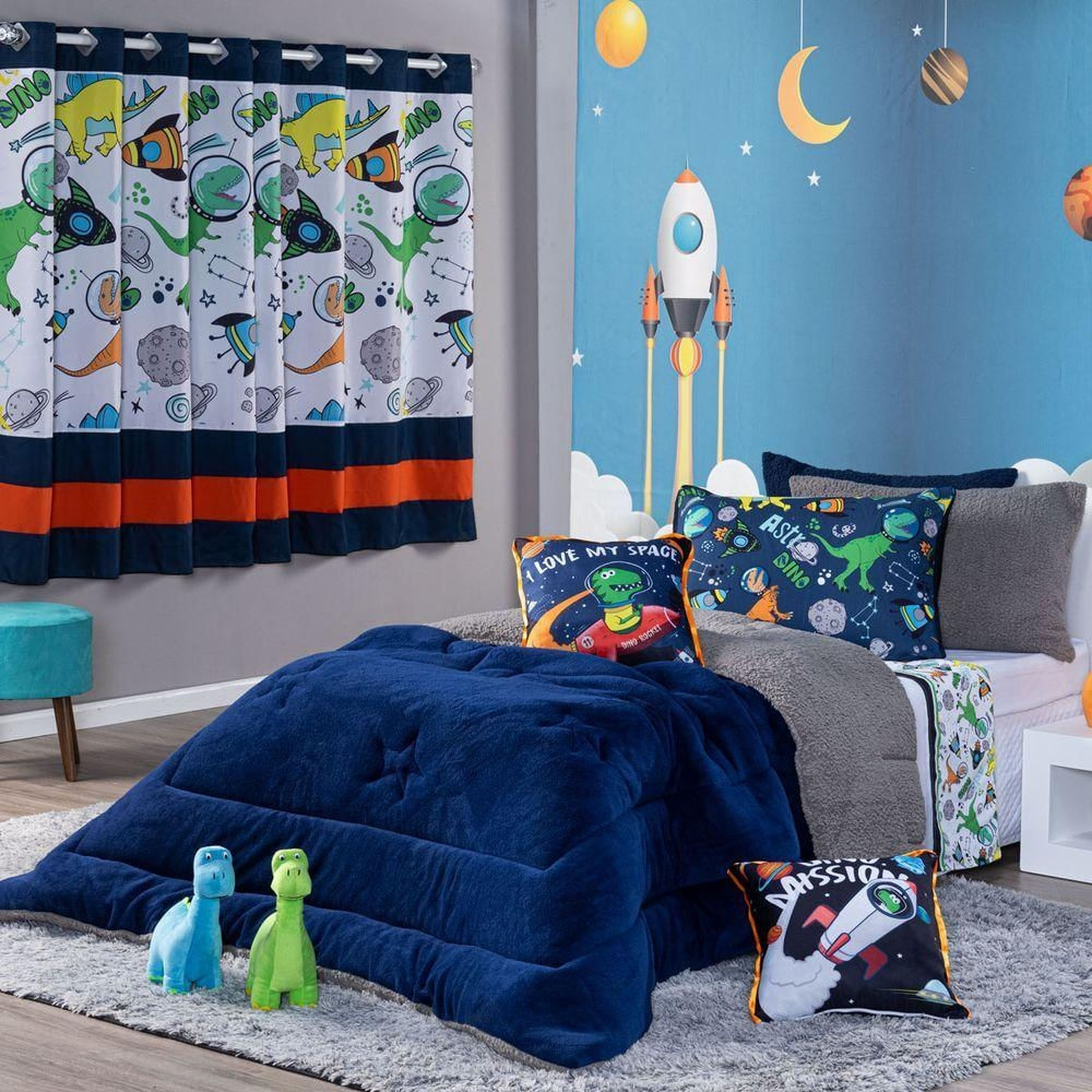 Kit Coberdrom Solteiro Astrodino Azul Marinho Com Almofadas Estampadas 04 Peças - Dupla Face Sherpa E Mantinha