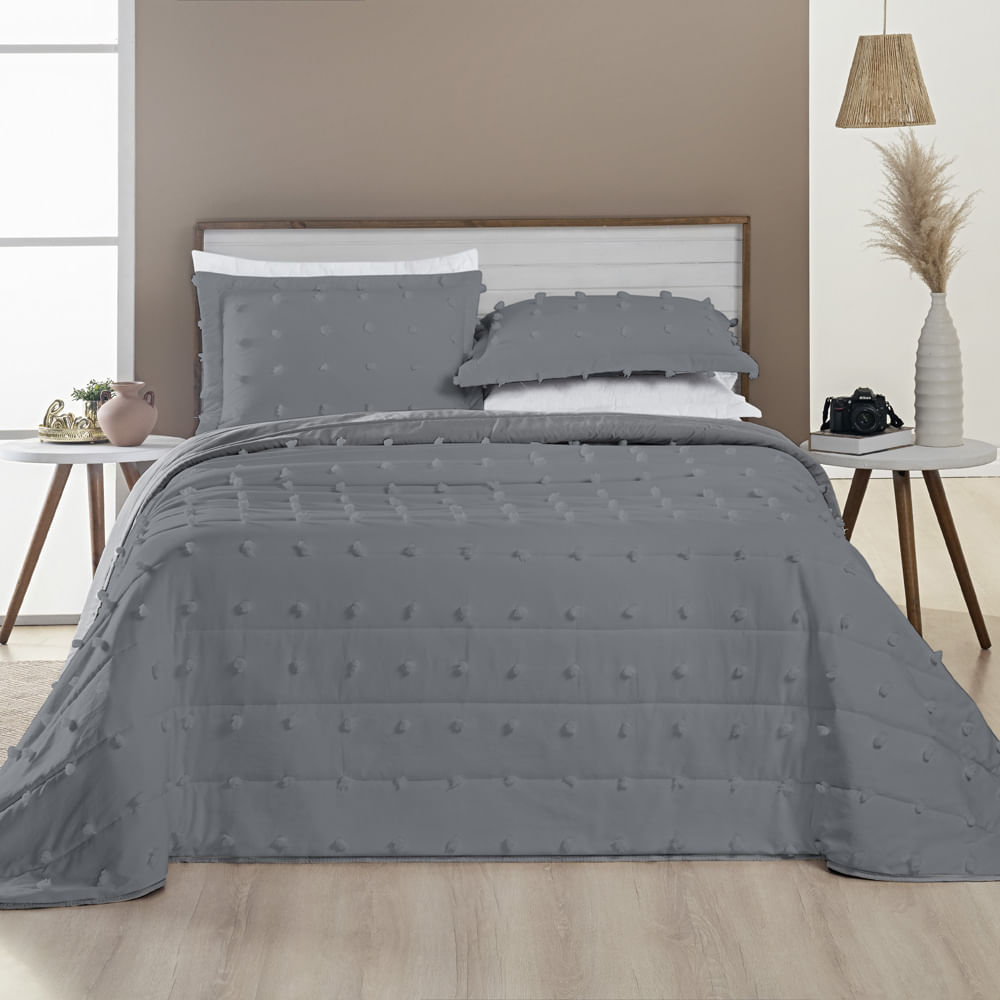 Kit Cobre Leito Colcha Alexa Pompom Casal Padrão Dupla Face Micropercal 3 Peças - Cinza