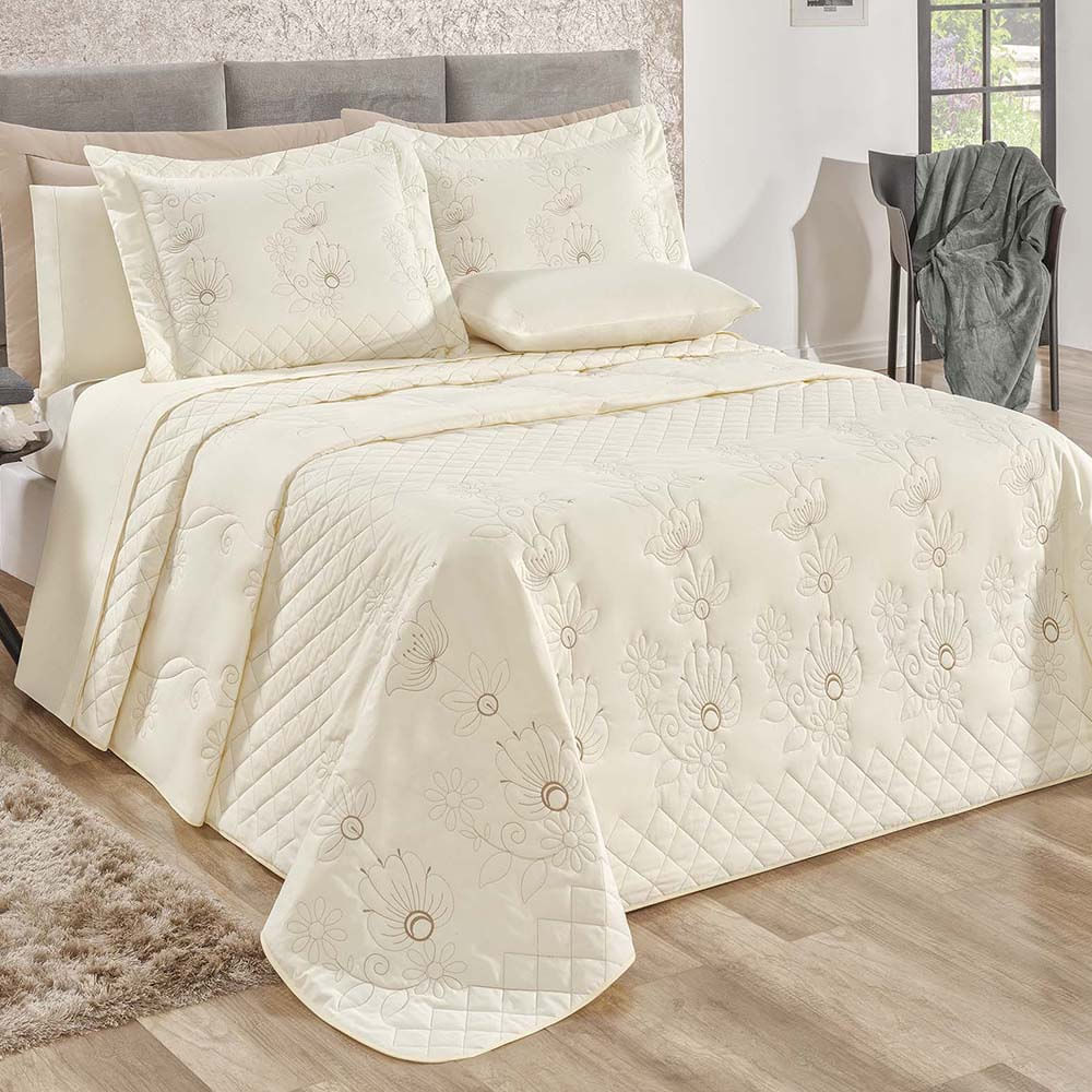 Kit Cobre Leito Colcha Atena Queen 5 Peças 100% Algodão 150 Fios Bordado Floral - Marfim