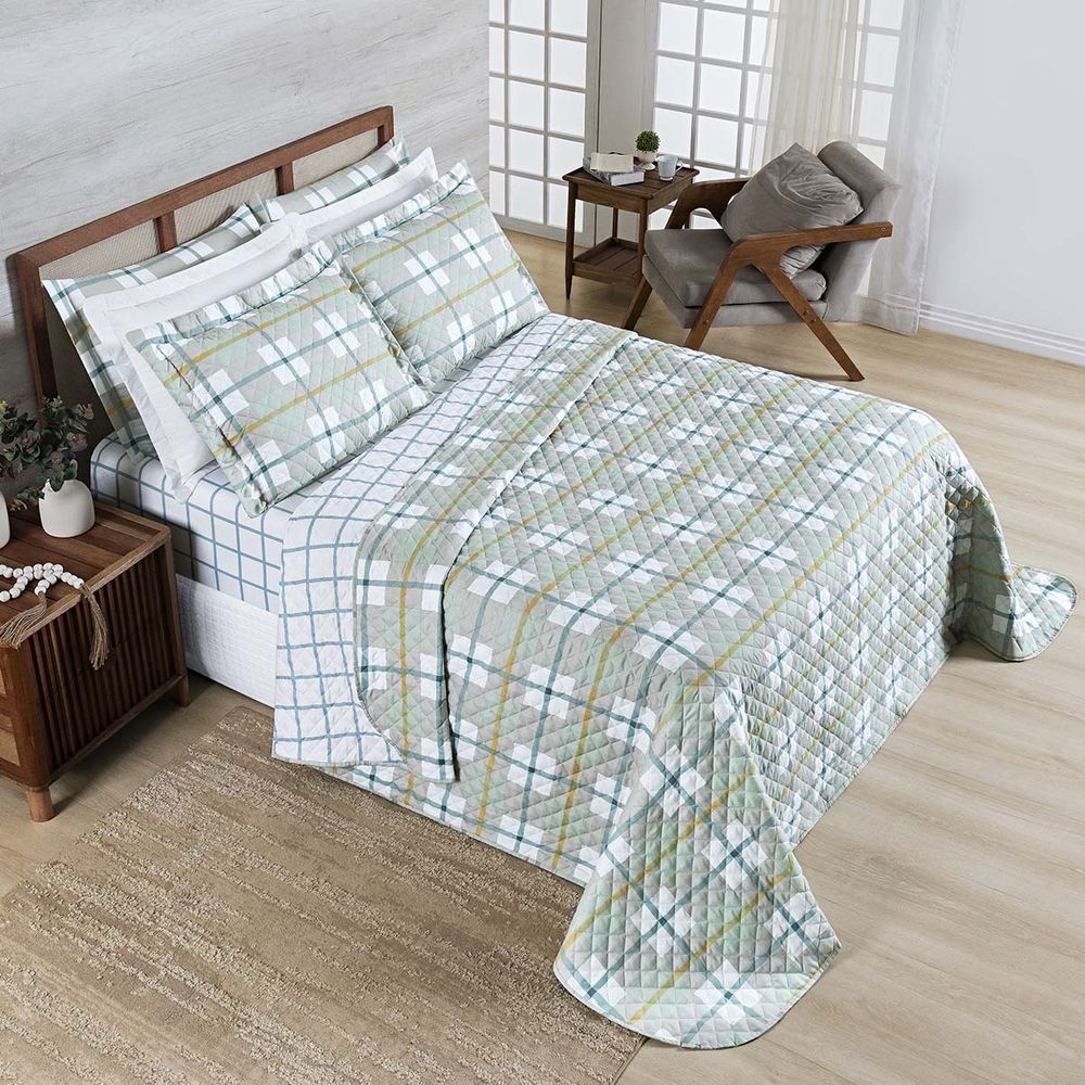 Kit Cobre Leito Colcha Belle Queen Estampado Dupla Face 400 Fios 3 Peças Grid Verde