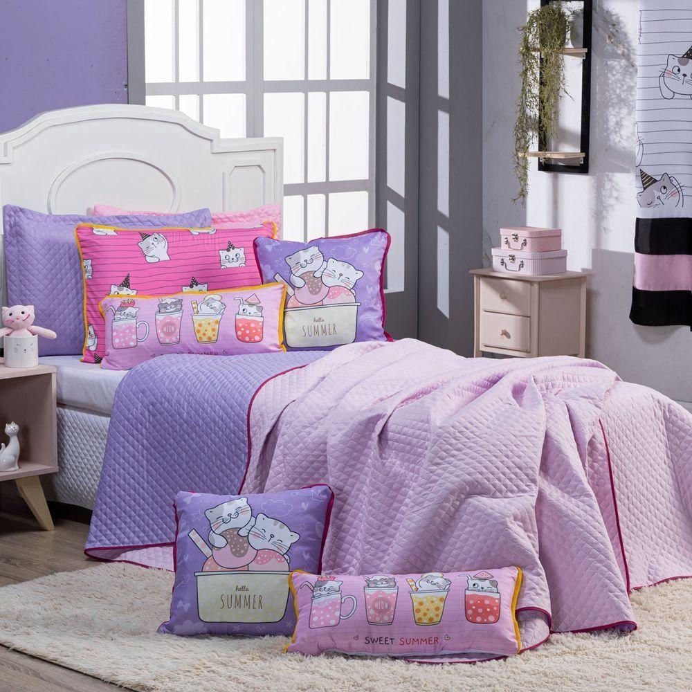 Kit Cobre Leito Colcha Casal Padrão Gatinhos Rosa/lilás Dupla Face Com Almofadas Estampadas 07 Peças