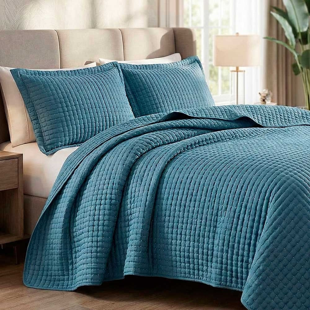 Kit Cobre Leito Colcha Claire Queen 3 Peças Micropercal 300 Fios Bordado - Azul - 100% Poliéster
