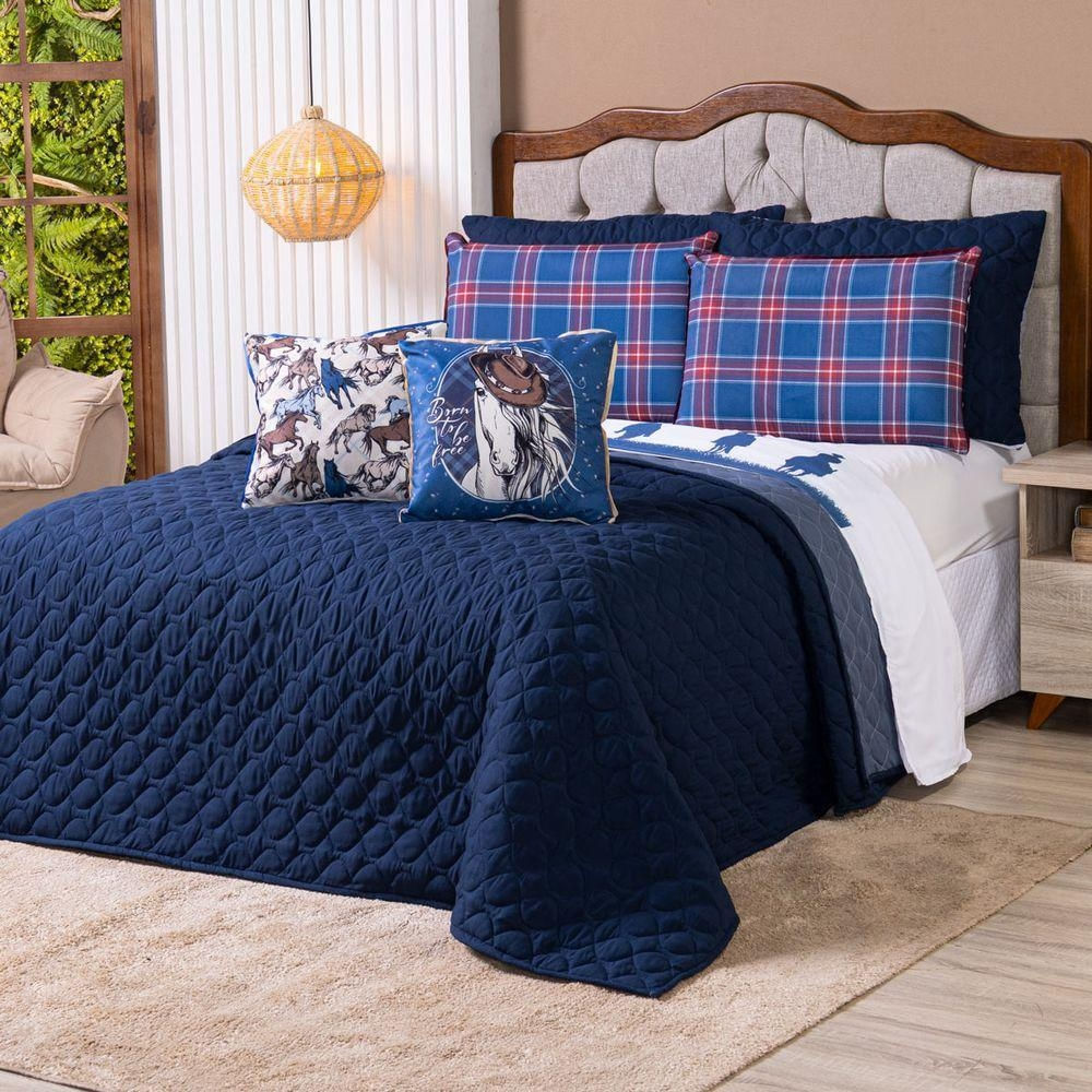 Kit Cobre Leito Colcha King Country Com Almofadas Estampadas 07 Peças - Dupla Face Percal 300 Fios Matelado Cor Azul
