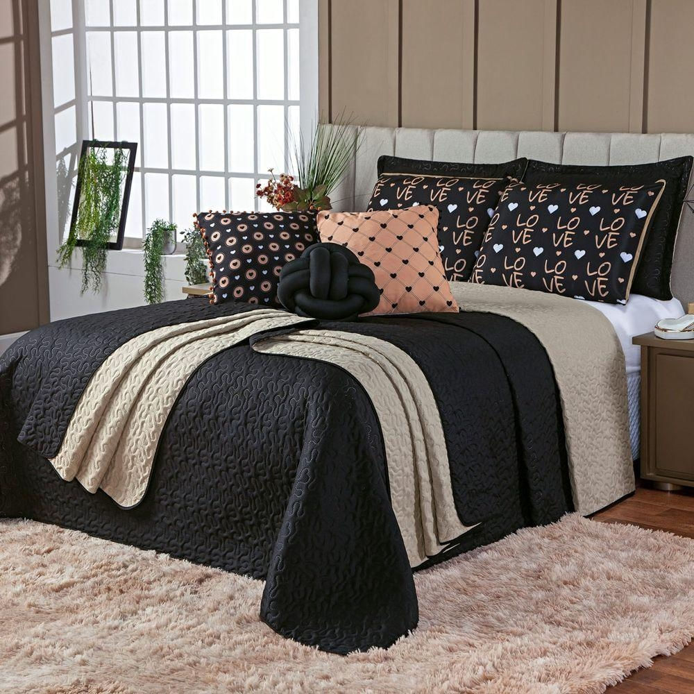 Kit Cobre Leito Colcha King Golden Love Preto/caqui Dupla Face Com Almofadas Estampadas 08 Peças