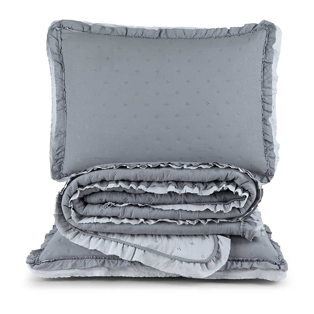 O matelado ultrassônico com desenho delicado confere ao kit um visual elegante e moderno, sem o uso de costuras aparentes. Além disso, a colcha é dupla face, permitindo variar a arrumação da cama de forma simples, criando diferentes combinações de estilo no quarto.