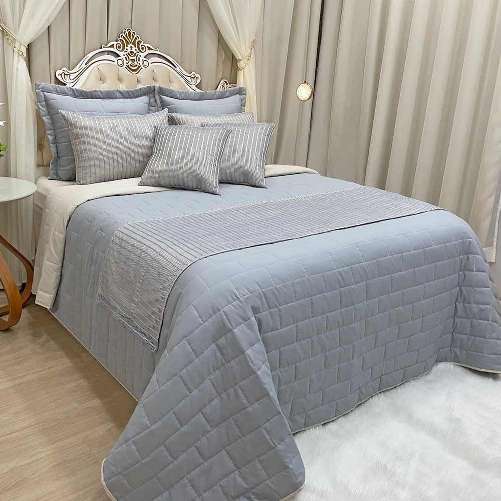 Kit Cobre Leito Colcha Luxo King 10 Peças MicroPercal 200 Fios Dupla Face Xale Brilhante - Cinza - 100% Poliéster