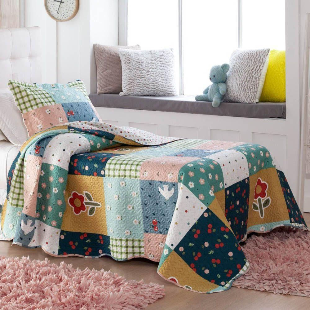 Kit Cobre Leito Colcha Magic Solteiro Infantil 2 Peças Microfibra 180 Fios Margarida Patchwork 100% Poliéster