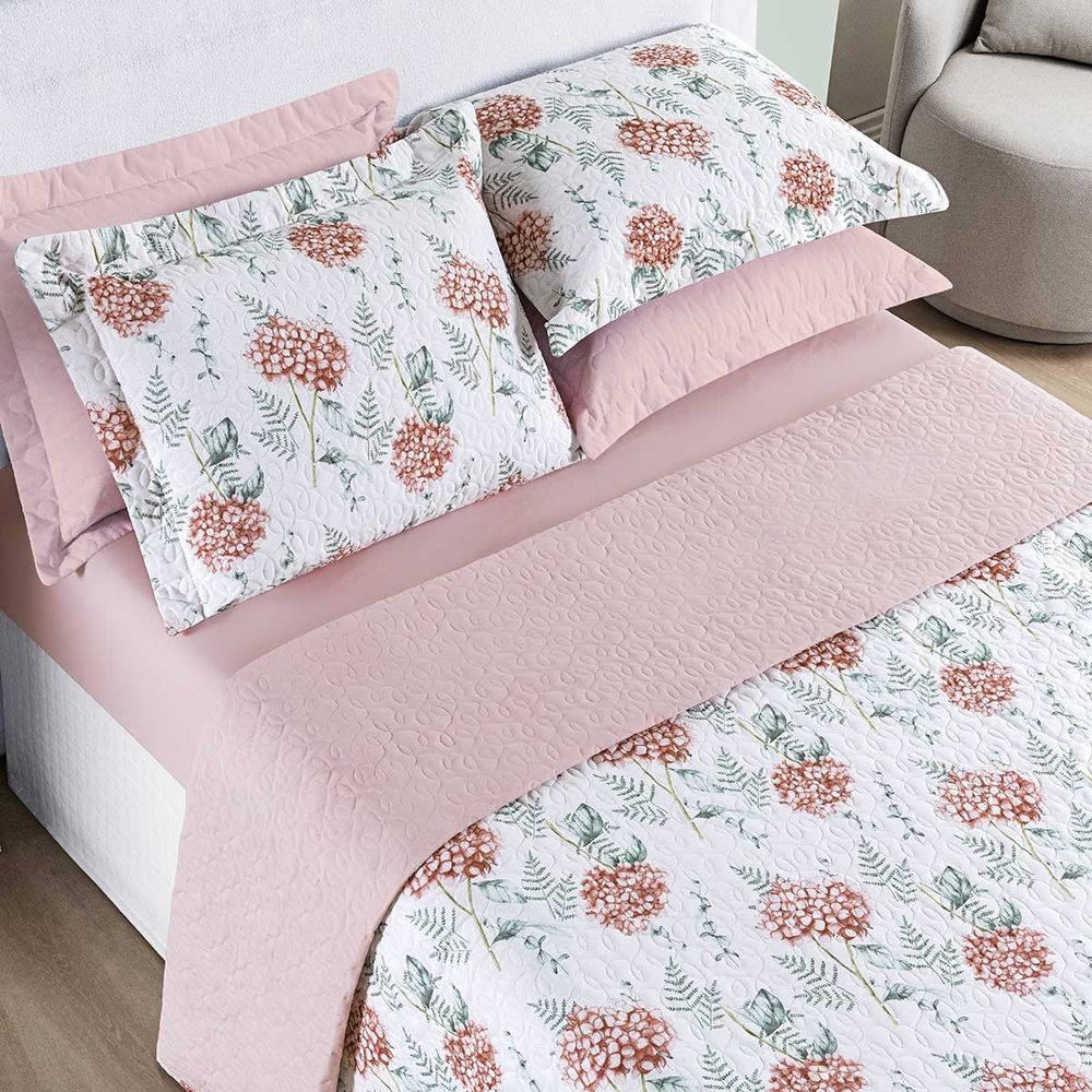 Kit Cobre Leito Colcha Maris King Estampado Dupla Face Percalle 200 Fios 3 Peças Hortênsia Salmão