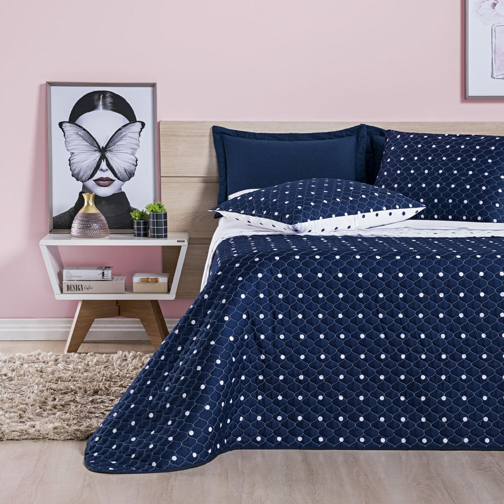 Kit Cobre Leito Colcha Meggy Poá Solteiro Dupla Face Micropercal 200 Fios 2 Peças - Azul Marinho