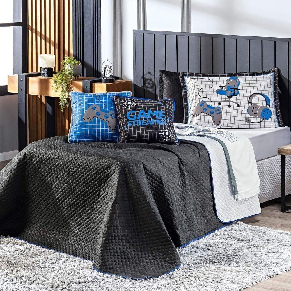 A Nova Coleção Game Streamer em Microfibra tem um toque suave e macio, o tecido caracteriza-se por ser muito leve, confortável, sedoso, com secagem rápida e ótimo caimento. Vem trazendo estilo para a decoração de seu quarto na nova tendência Dupla Face, podendo utilizar as 2 cores do cobre leito! Ficará de ótimo bom gosto e elegância, acompanhando porta-travesseiros e duas almofadinhas estampadas super modernas e temáticas! Tudo para combinar com a decoração, perfeito para dar aquele upgrade no ambiente ou para presentear o Gamer que você ama! Confira!Contém:01 Cobre Leito 2,15m X 2,60m02 Porta Travesseiros Liso Matelados (Preto) 70cm X 50cm02 Porta Travesseiros Estampados 70cm x 50cm02 Almofadas Quadradas Cheias Estampadas 45cm x 45cmOBS: Lençol vendido separadamenteComposição:Tecido Superior: 100% Poliéster MicrofibraTecido Inferior: 100% Poliéster MicrofibraPorta Travesseiro Liso Matelado Preto: 100% Poliéster MicrofibraPorta Travesseiro Estampado: 100% Poliéster MicrofibraEnchimento: 100% PoliésterComposição Refil:Externo: 100% PolipropilenoEnchimento: 100% PoliuretanoInstruções de Uso e Lavagem:Vide etiqueta do produto.Foto meramente ilustrativa.Variação das cores podem ocorrer de acordo com o monitor.