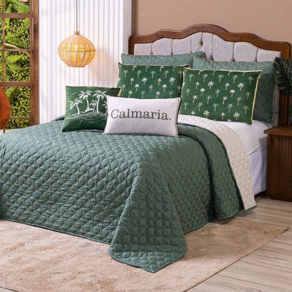 Kit Cobre Leito Colcha Queen Verano Com Almofadas Estampadas 07 Peças - Dupla Face Percal 300 Fios Matelado Cor Coqueiro