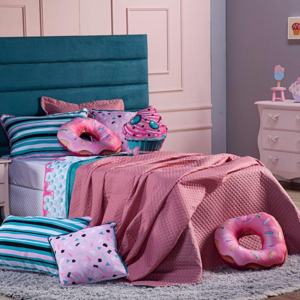 Kit Cobre Leito Colcha Solteiro Cake Donuts Rosê/tiffany Dupla Face Com Almofadas Estampadas 06 Peças