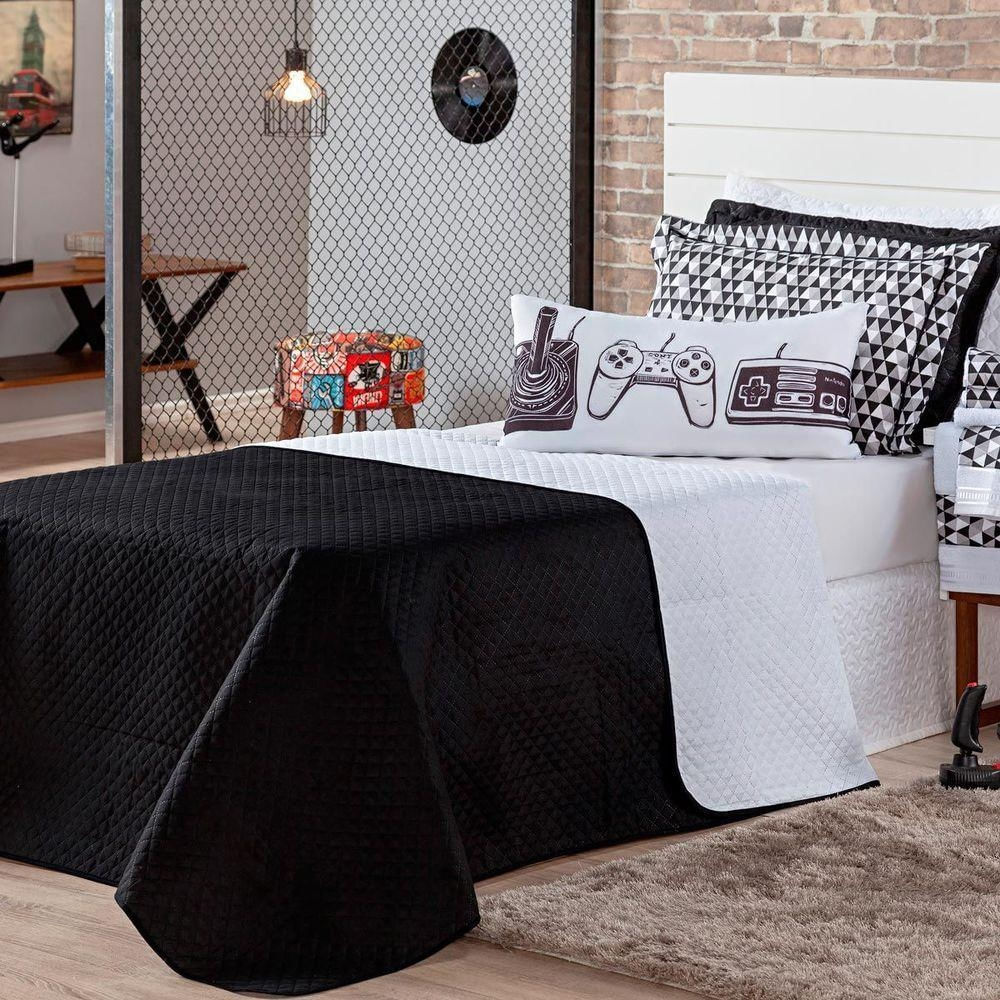 Kit Cobre Leito Colcha Solteiro Game Retrô Preto/branco Dupla Face Com Almofada Estampada 04 Peças