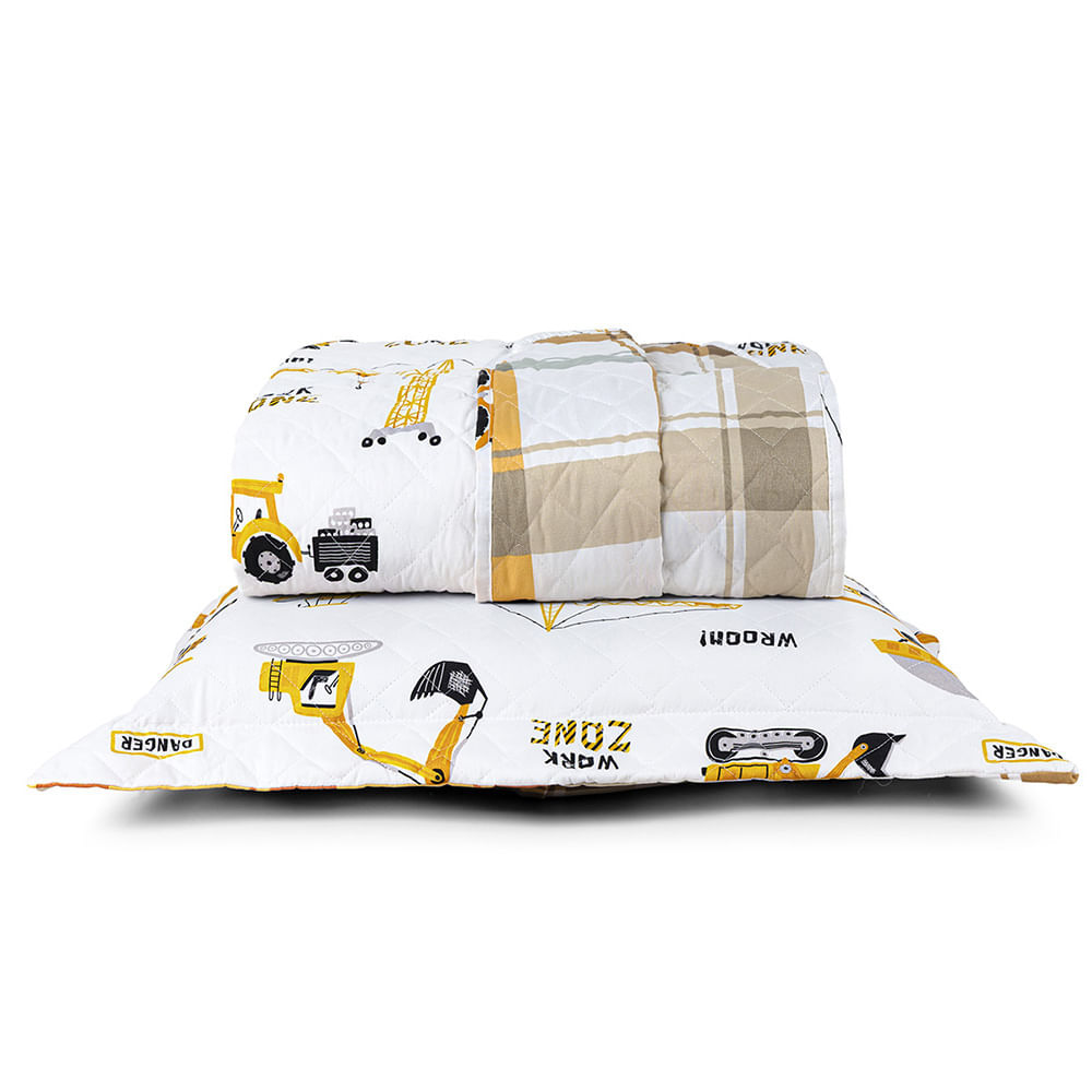 Kit Cobre Leito Colcha Solteiro Infantil Lutti Dupla Face 200 Fios 2 Peças Trator Caminhão Branco