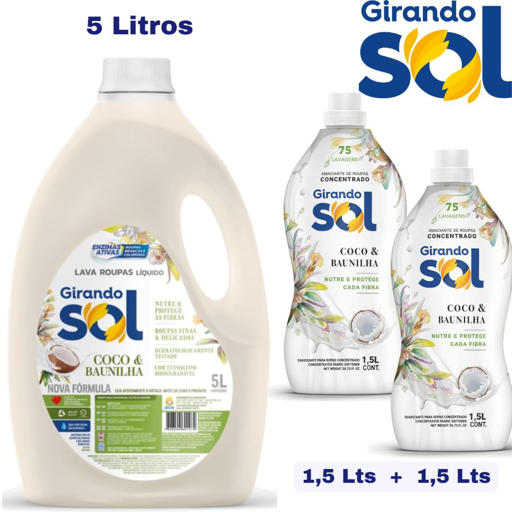 Kit com 1 Lava Roupas 5L + 2 Amaciante Líquido 1,5L Roupas Delicadas Girando Sol Coco e Baunilha