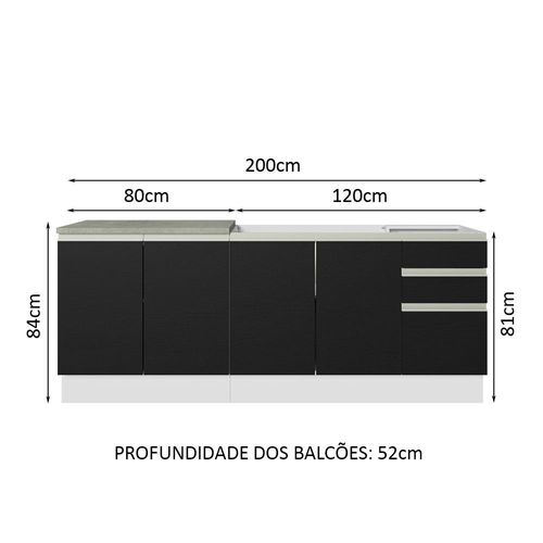 O balcão maior tem 120 cm de largura, com duas portas e três gavetas. Além disso, possui espaço para colocação de pia de inox ou pedra, na medida de 120 x 52 cm. O outro balcão possui 80 cm de largura, conta com duas portas e o tampo pode ser recortado para instalação de cooktop.