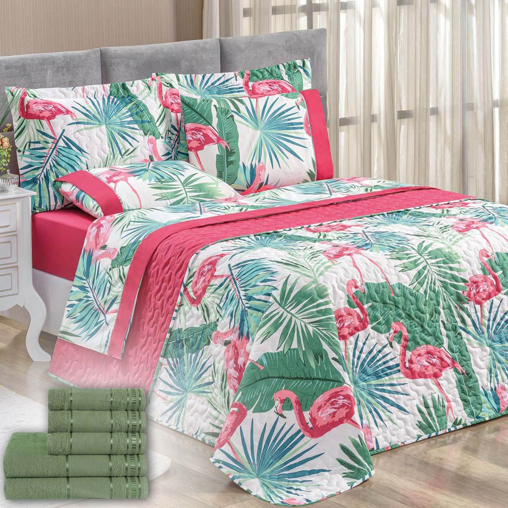 Kit Combo Premier Cobre Leito Super King Micro Percal 200 Fios + Toalhas de Banho 8 Peças - Pink Verde Flamingo