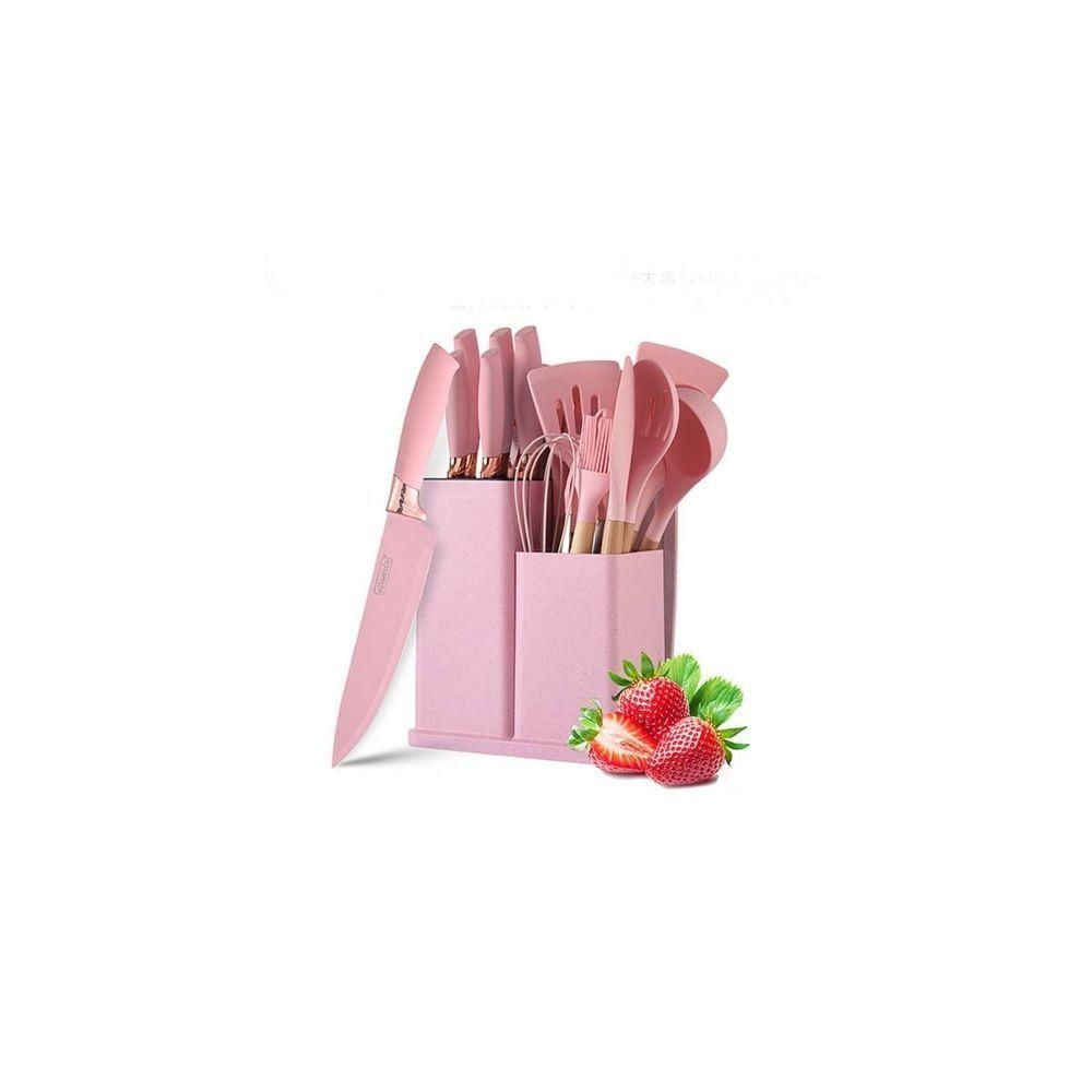 Kit Completo De Utensílios De Cozinha Luxuosos 19 Peças Com Tablet Espátula De Silicone Faca Tesoura - rosa