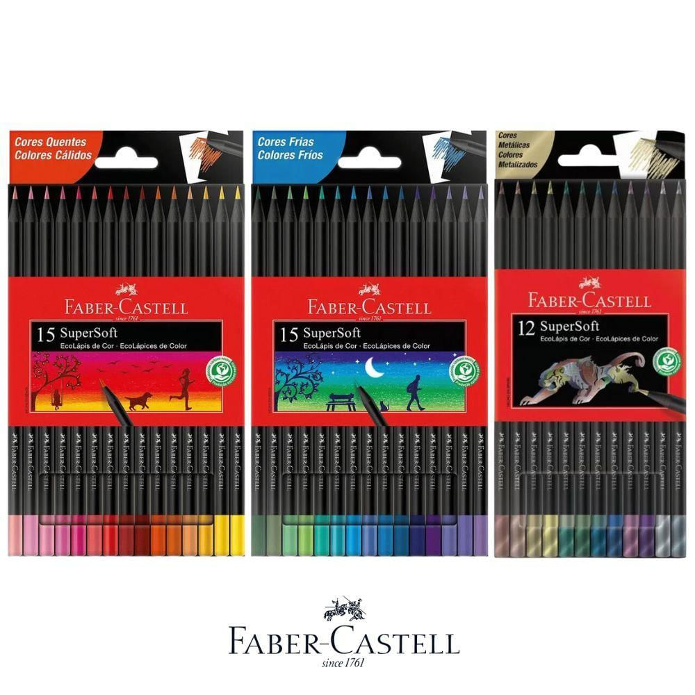Acompanha o produto: - 1 Lápis de Cor SuperSoft Com 15 Cores Quentes Faber-Castell 1 Lápis De Cor Super Soft Com 15 Cores Frias Faber Castell 1 Lápis De Cor Supersoft Com 12 Cores Metálicas Faber-Castell
