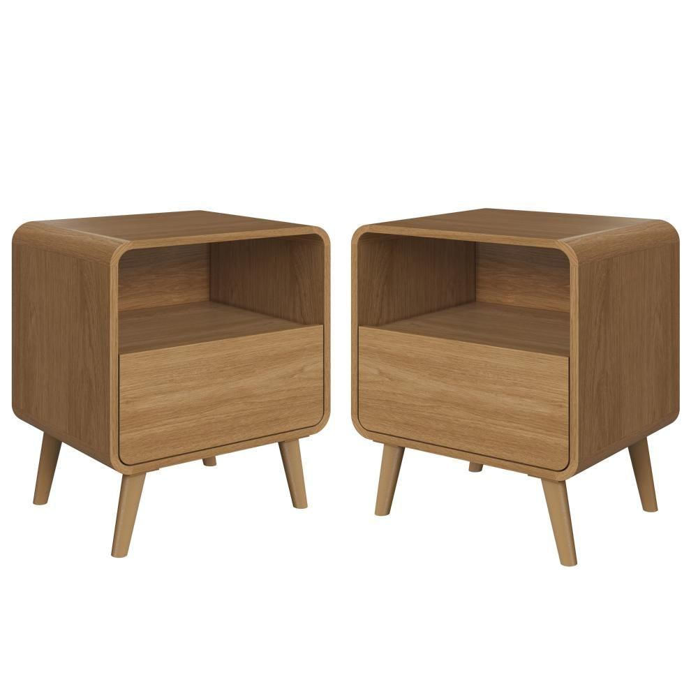 Kit Conjunto 02 Mesas De Cabeceira Canto Curvo Com Nicho 01 Gaveta E Pés Palito Retrô Carvalho Xingu